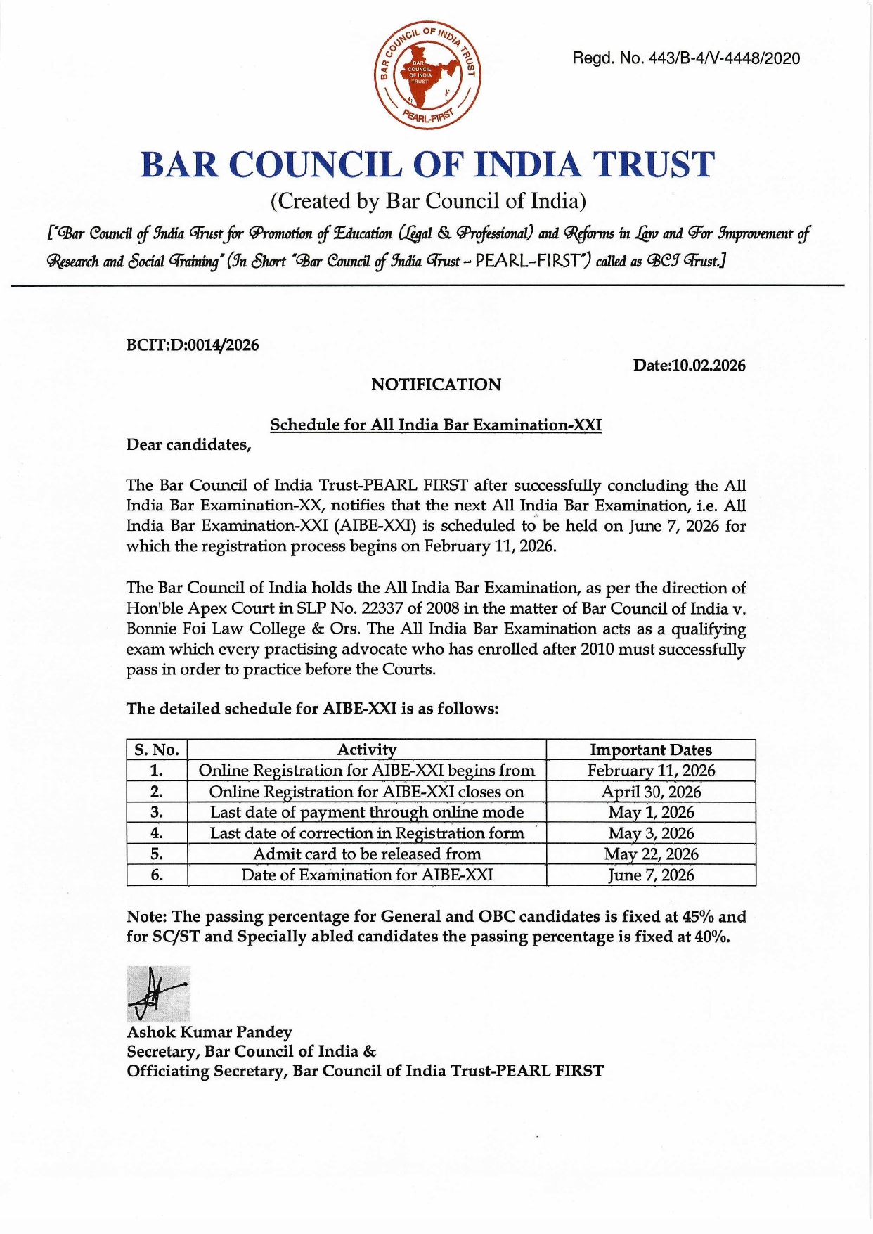 नई दिल्ली। Bar Council of India Trust (BCI Trust) ने अखिल भारतीय बार परीक्षा-XXI (AIBE-XXI) 2026 का आधिकारिक कार्यक्रम जारी कर दिया है। अधिसूचना संख्या BCIT:D:0014/2026 दिनांक 10 फरवरी 2026 के अनुसार AIBE-XXI का आयोजन 7 जून 2026 को किया जाएगा, जबकि ऑनलाइन रजिस्ट्रेशन प्रक्रिया 11 फरवरी 2026 से शुरू हो गई है । यह परीक्षा उन विधि स्नातकों के लिए अनिवार्य है जो भारत में अधिवक्ता के रूप में प्रैक्टिस करना चाहते हैं और ‘सर्टिफिकेट ऑफ प्रैक्टिस’ प्राप्त करना चाहते हैं।